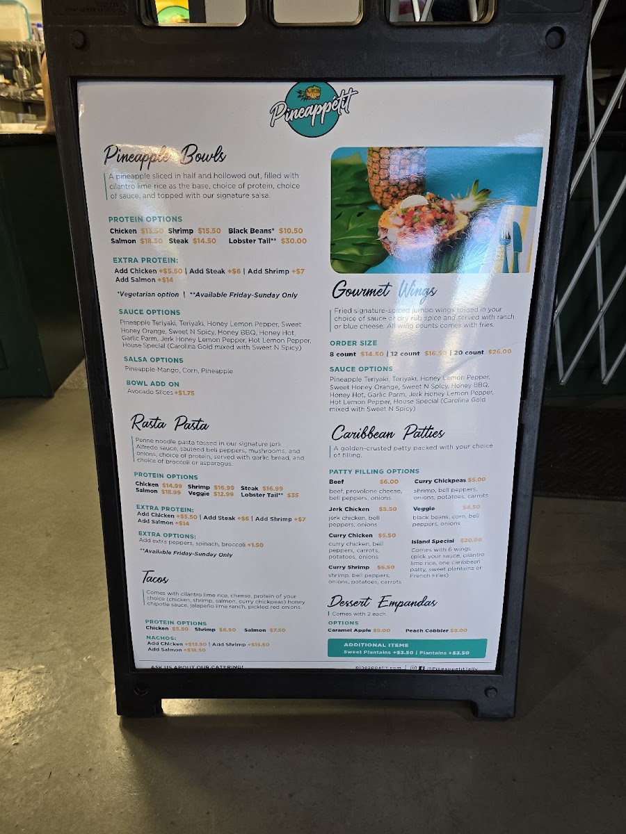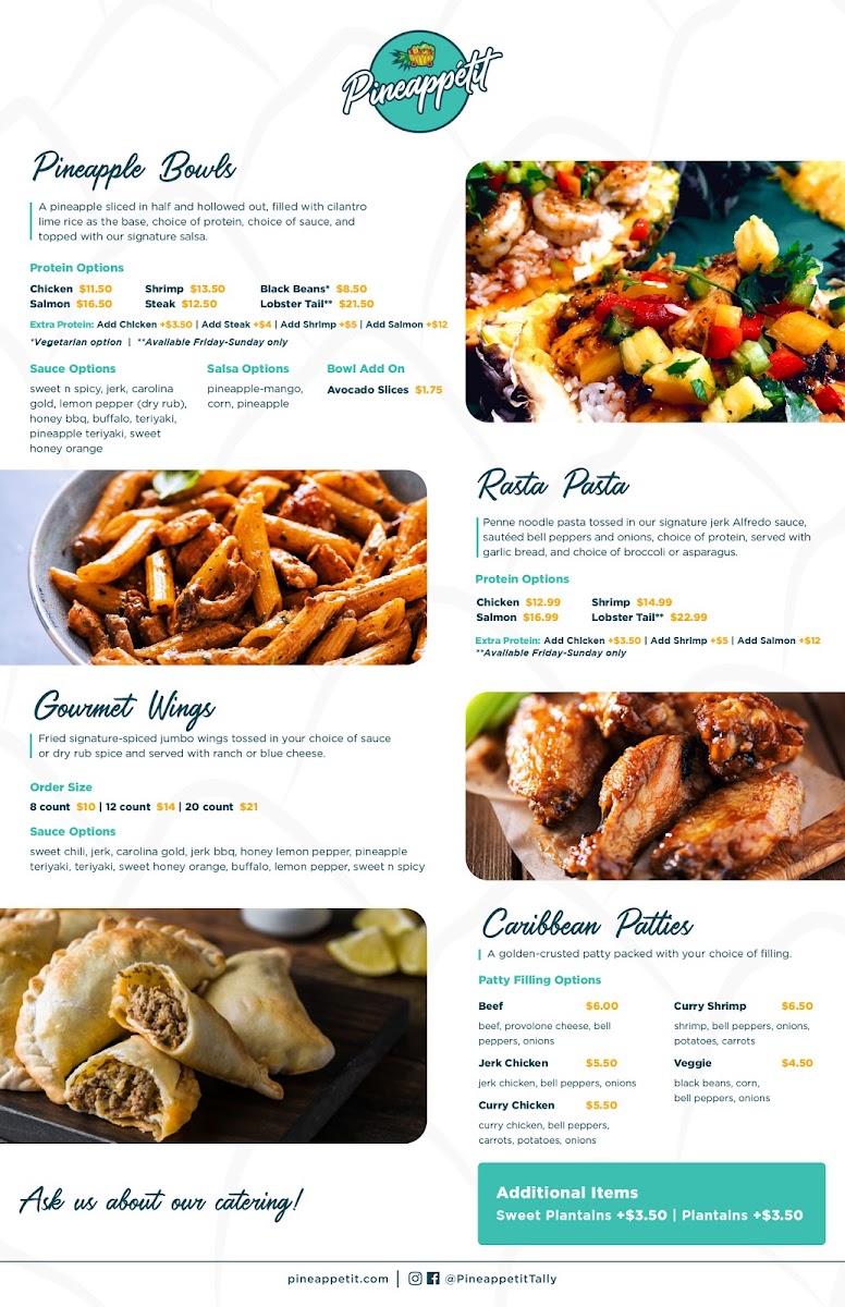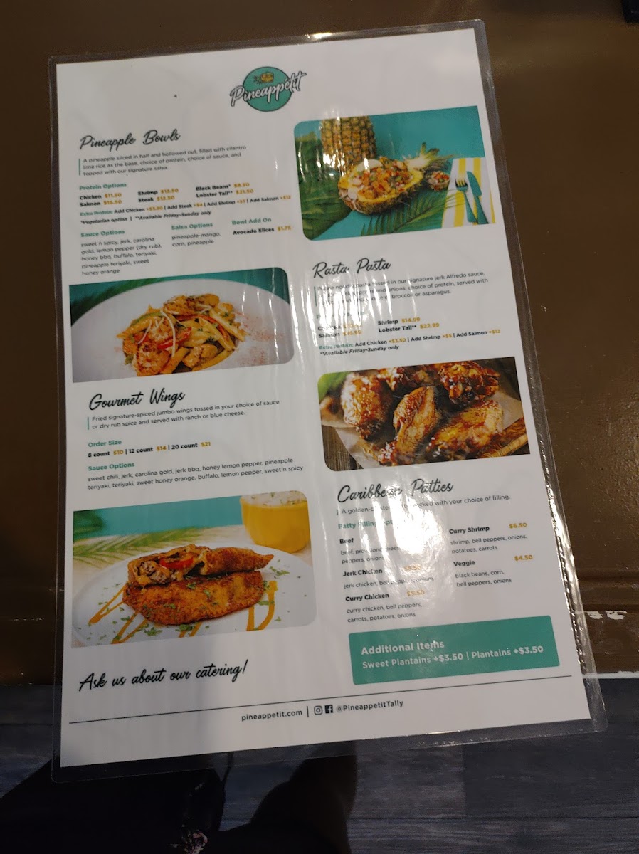 If you're in the mood for something fresh and flavorful, you're in the right place. The Pineappétit Menu offers a unique twist on your favorite dishes, all packed with vibrant ingredients that highlight the best of local flavors. Located in the heart of Tallahassee, at 626 Railroad Sq, this spot brings a refreshing approach to casual dining, whether you're grabbing a quick bite or sitting down for a meal with friends. From savory starters to satisfying mains, every dish is crafted with care to keep you coming back for more. And don't forget to try their signature pineapple-inspired dishes that offer a perfect balance of sweetness and tang. Every bite feels like a celebration of bold tastes and good vibes. Whether you're new to the area or a regular, the Pineappétit Menu is sure to become a favorite.